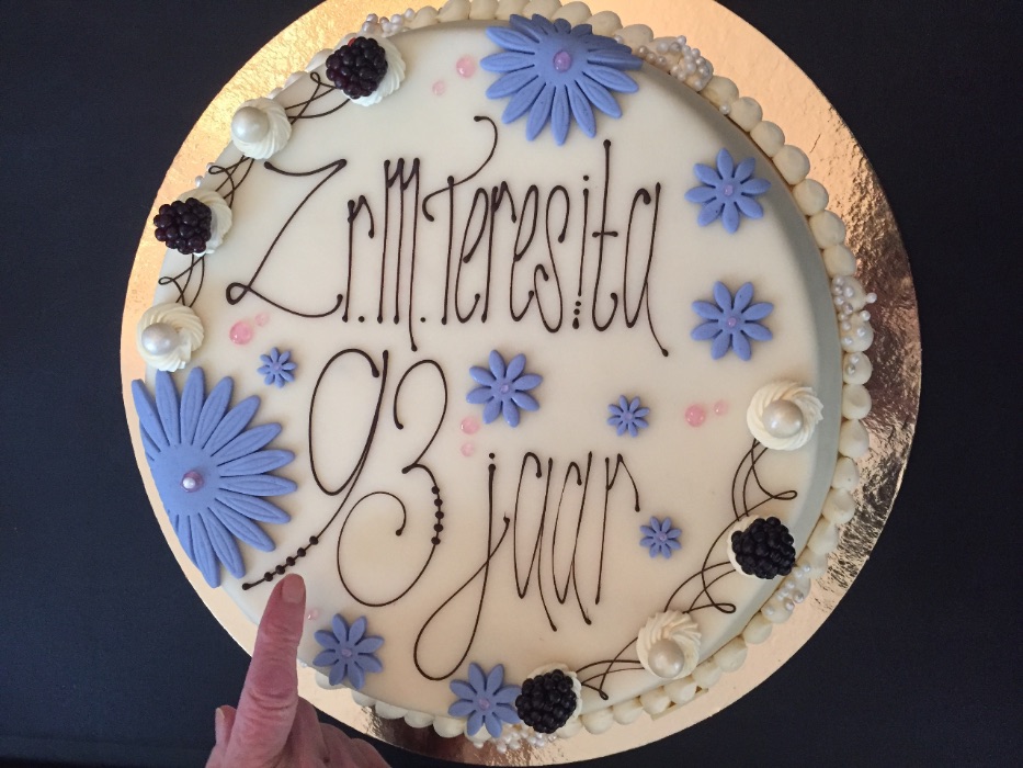 Vandaag, op 19 februari, mocht onze zuster Teresita haar 93e verjaardag vieren. Een bijzondere leeftijd voor een bijzondere zuster! Dat werd natuurlijk gevierd met taart en veel felicitaties. De taart vond ze prachtig: “er staat zelfs de rozenkrans op” (zie foto).