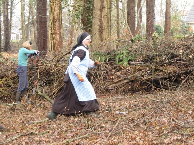 Komt u ook helpen op de nationale natuurwerkdag 2018? Elk jaar wordt dit evenement opnieuw georganiseerd. Ook dit jaar zijn de zusters Karmelietessen in Vogelenzang weer opzoek naar enthousiaste vrijwilligers die zich op deze dag willen inzetten om het landgoed weer een stukje mooier te maken. Samen met de vaste groep vrijwilligers worden er verschillende werkzaamheden uitgevoerd. Bladblazen, schoffelen, takkenrillen maken, sneeuwbessen en esdoornzaailingen rooien, onkruid van de terrassen en trappen verwijderen,paden in het bos weer begaanbaar maken, het bestaande insectenhotel en de muizenruiter repareren en aanvullen, gaten boren in stammetjes, takken, dennenappels, kastanjes, beukennootjes e.d. verzamelen voor het insectenhotel en de muizenruiter. De vorig jaar gebruikte muizenruiter blijkt effectief. Al verscheidenen malen zijn er roofvogels gespot, uit op een muis.