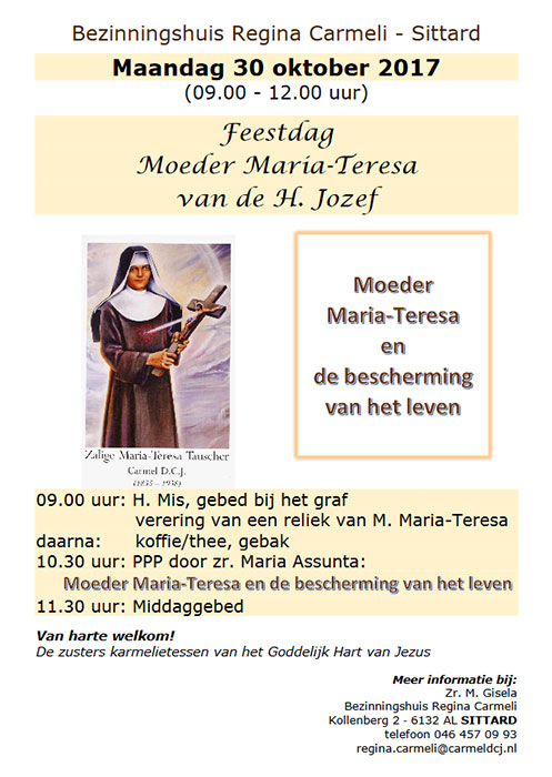 | 9.00 uur: | H. Mis, gebed bij het graf, verering van een reliek van M. Maria-Teresa |